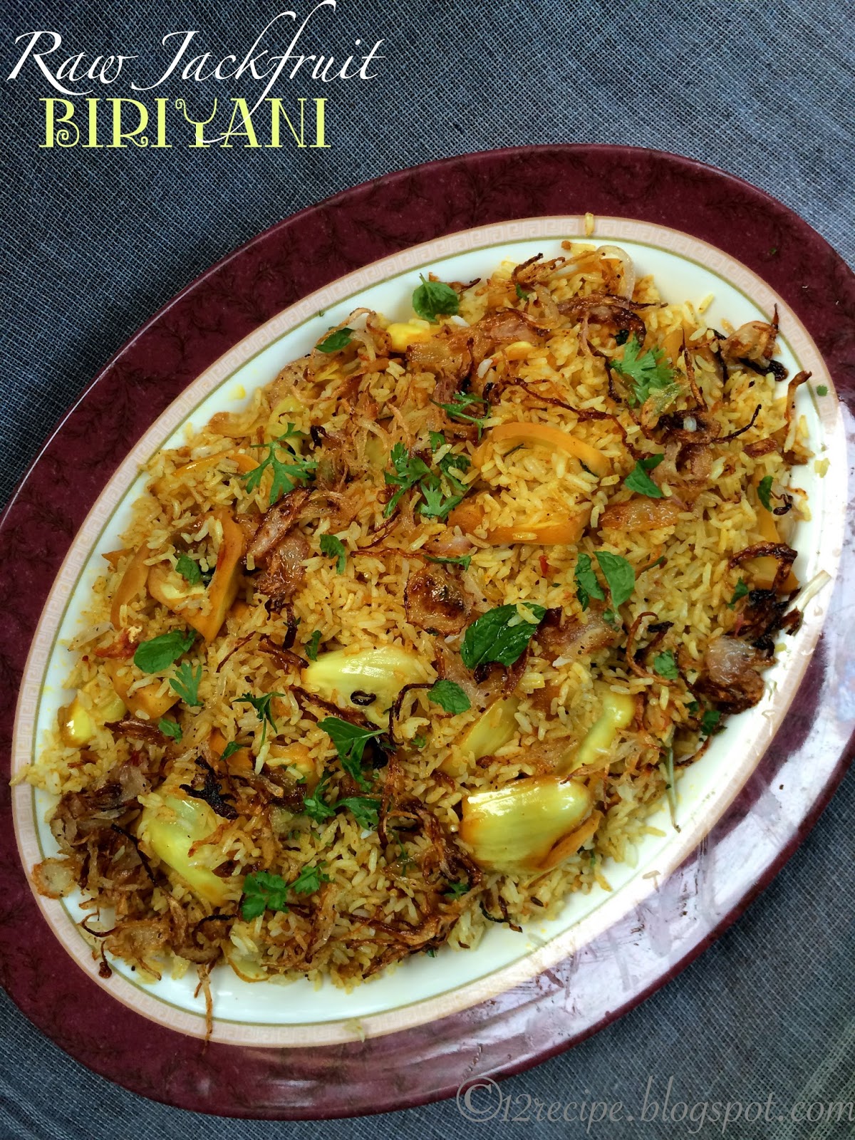Jackfruit biriyani (kathal biriyani) is a mildly spicy and aromatic rice preparation in which the delicious raw jackfruit gravy is topped with basmati rice. It is prepare like the normal dum biriyani method and of course a great treat for the veggies.